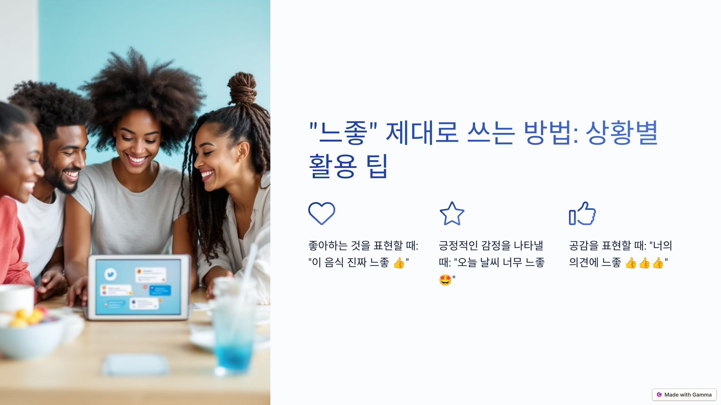 이처럼 ‘느좋’은 빠른 속도보다는 여유를 중시하는 태도를 나타낼 때 유용하게 사용할 수 있어요.
