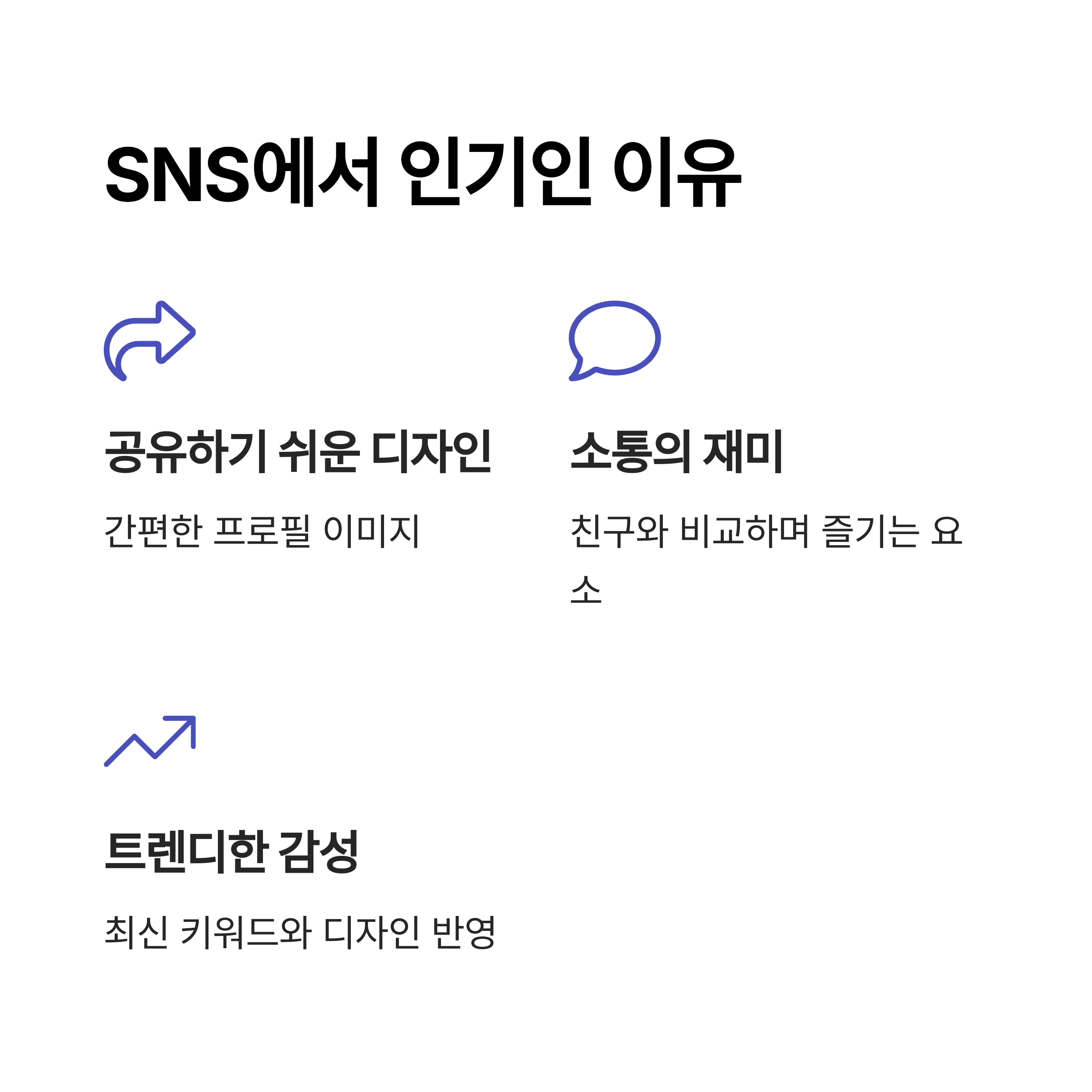 이런 요소들이 합쳐져서 마이프로필테스트는 그야말로 ‘SNS 최적화 콘텐츠’라고 할 수 있어요. 사람들이 좋아할 수밖에 없는 구조를 갖췄고, 감성과 재미, 공유성까지 삼박자를 완벽히 갖추고 있죠. 그래서 테스트 하나가 새로운 트렌드로 자리 잡은 거예요.