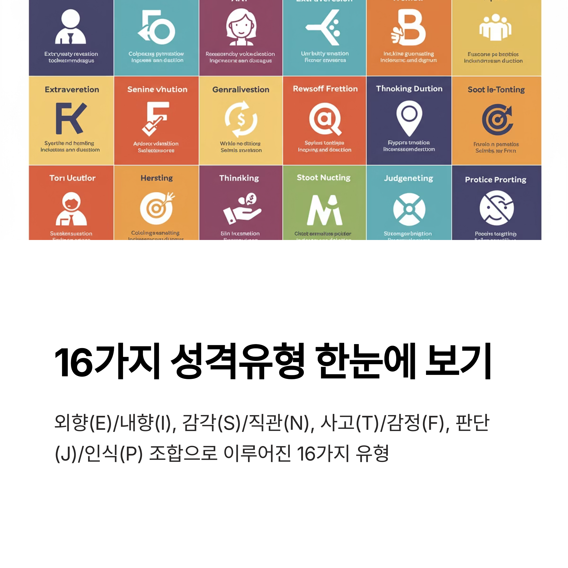 MBTI에서 도출되는 16가지 유형은 네 가지 지표의 조합으로 구성돼요. 각각의 조합은 특정한 성격 특성과 행동 스타일을 보여주고, 이를 통해 사람들은 자신과 타인의 특성을 이해할 수 있어요. 여기에 간단한 별명이나 슬로건을 붙이면 더 쉽게 기억할 수 있죠!
