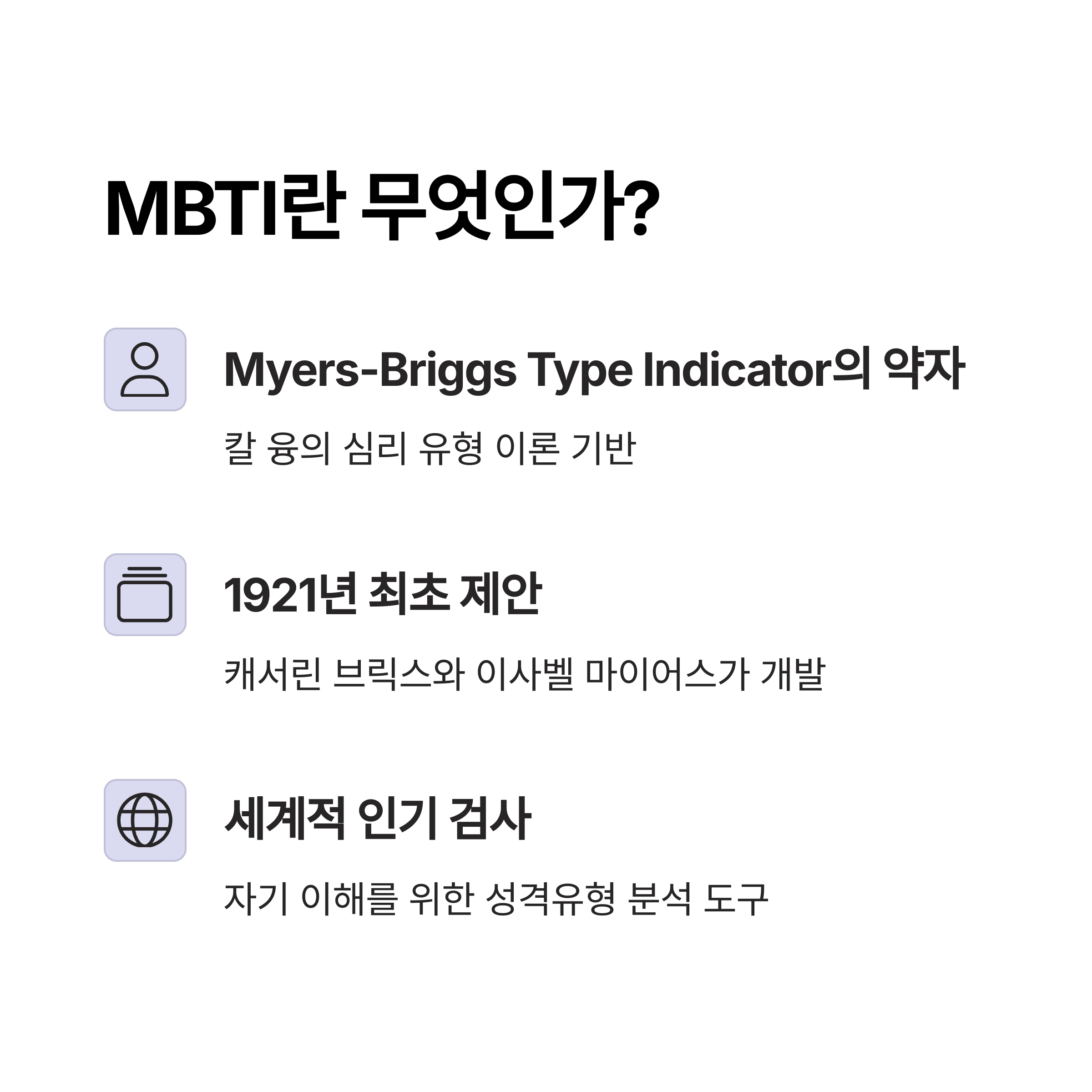 MBTI는 ‘Myers-Briggs Type Indicator’의 약자로, 사람의 성격을 16가지 유형으로 나누어 설명하는 성격 유형 검사예요. 1940년대에 미국의 이사벨 브릭스 마이어스와 그녀의 어머니 캐서린 쿡 브릭스가 개발했죠. 이들은 심리학자 칼 융의 성격 이론을 기반으로 MBTI를 체계화했어요.
