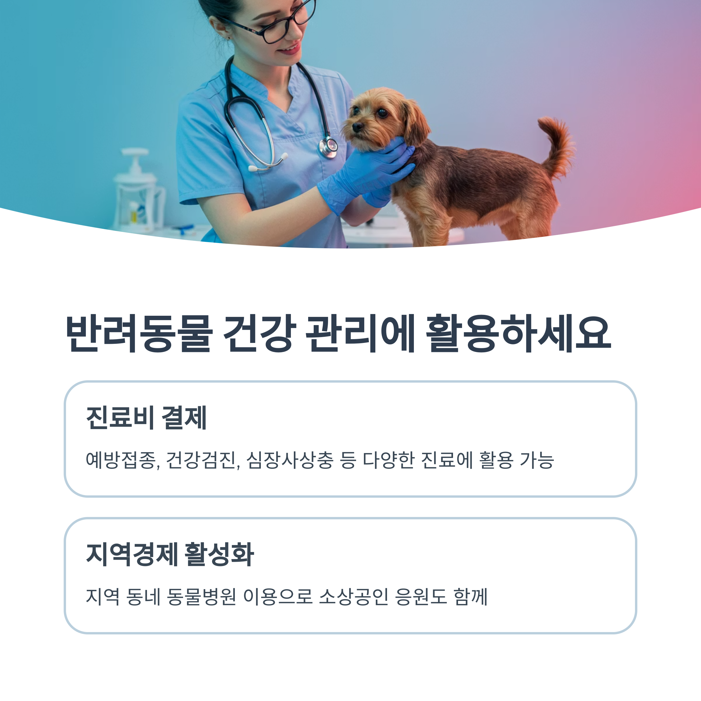 다만, 일부 대형 동물병원이나 프랜차이즈는 연매출 기준에 걸려서 제외되는 경우가 많아요. 그래서 동네 중소규모 병원을 중심으로 알아보시는 게 훨씬 효율적이에요. 특히 한의동물병원이나 자연치유병원도 요즘 많아졌는데, 이곳들도 조건이 맞으면 사용 가능하답니다.