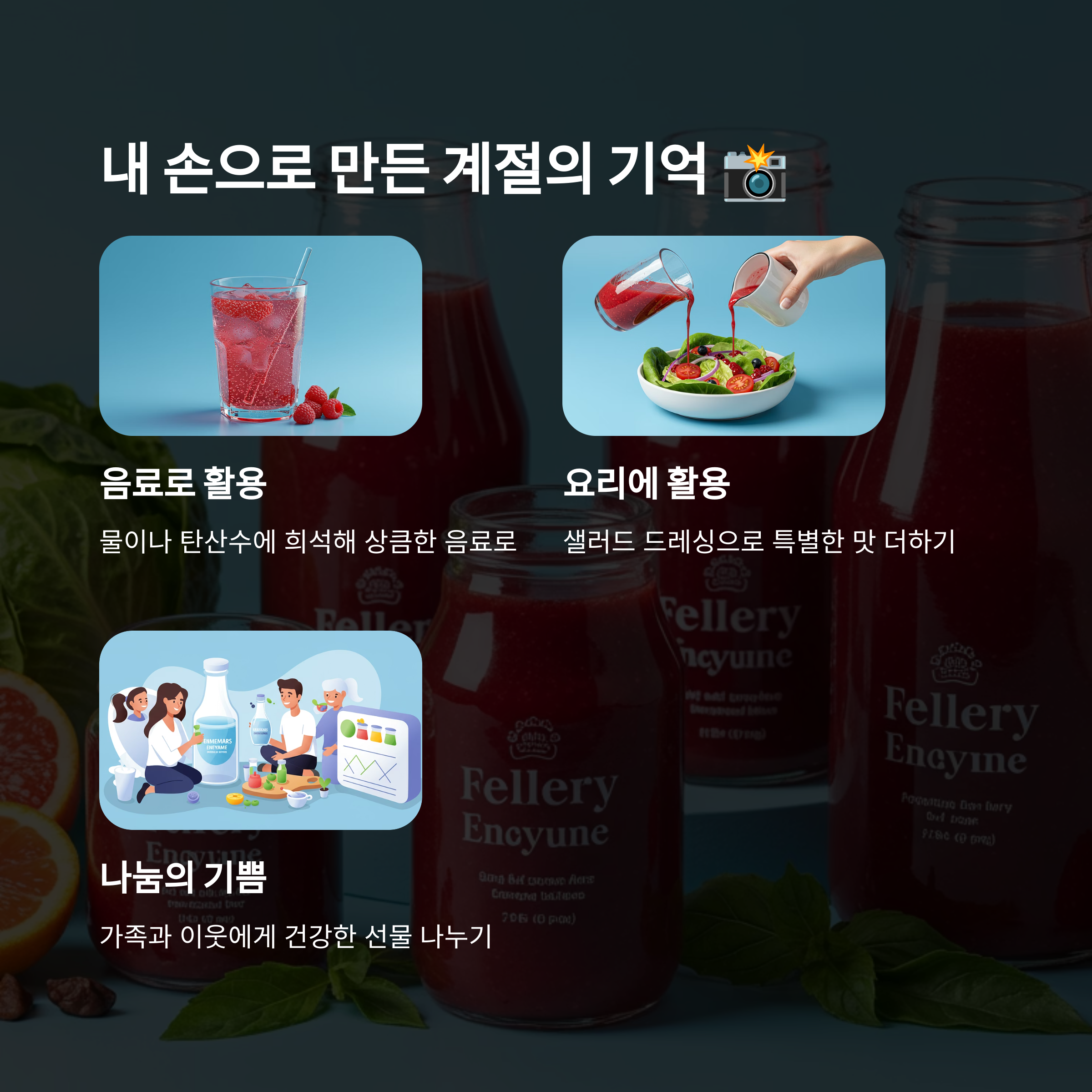효소가 완성된 날, 저는 그날 찍어두었던 사진들을 꺼내 다시 보았어요. 빨간 열매를 따던 날의 웃음, 설탕을 켜켜이 쌓으며 느꼈던 두근거림, 발효가 진행되는 걸 보며 설렜던 그 마음들. 모두가 그 유리병 안에 담겨 있었어요. 단순한 발효식품이 아니라 ‘기억의 병’ 같았죠.