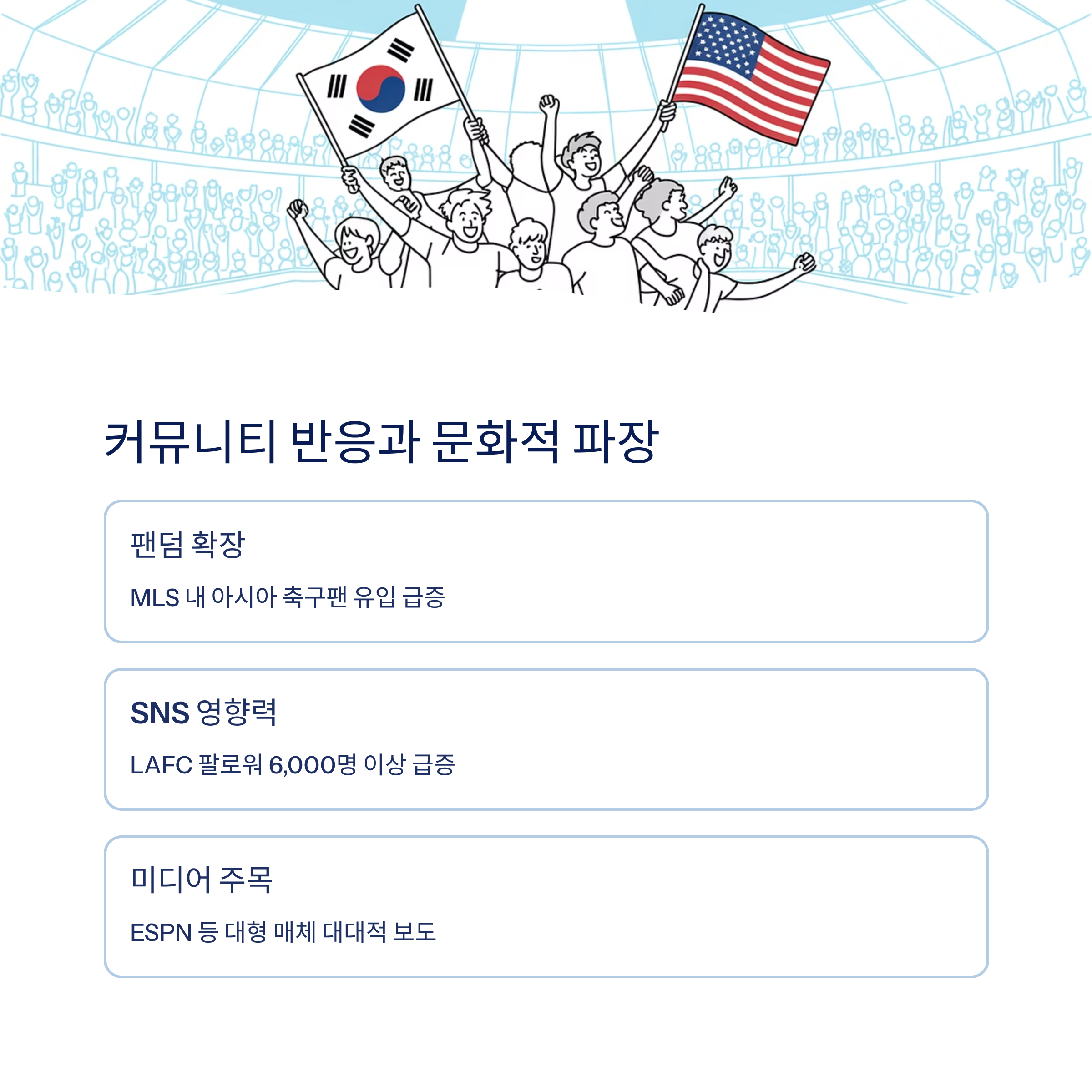 손흥민의 이적 이후, 미국 내 한인 커뮤니티는 물론 아시아계 커뮤니티 전체가 들썩였어요. 그가 LAFC 유니폼을 입고 데뷔한 날, 수많은 팬들이 경기장과 거리에서 같은 유니폼을 입고 축제를 벌였죠. 그 장면은 단순한 스포츠 응원을 넘어서 하나의 문화 이벤트 같았어요.