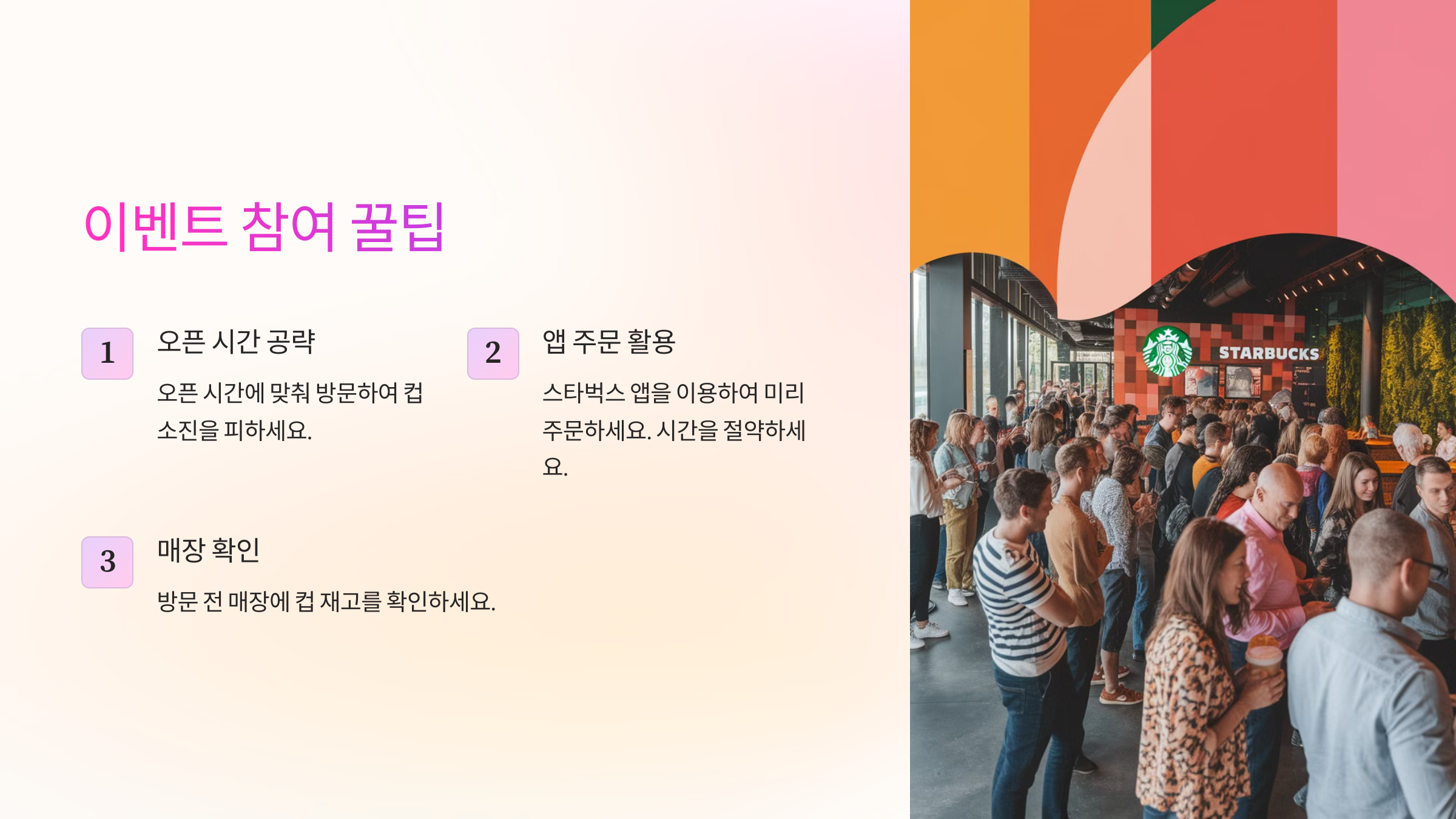 - 🚀 빠르게 방문하기: 이벤트 시작 시간인 오후 2시 직후에 방문하면 컵을 받을 확률이 높아요.