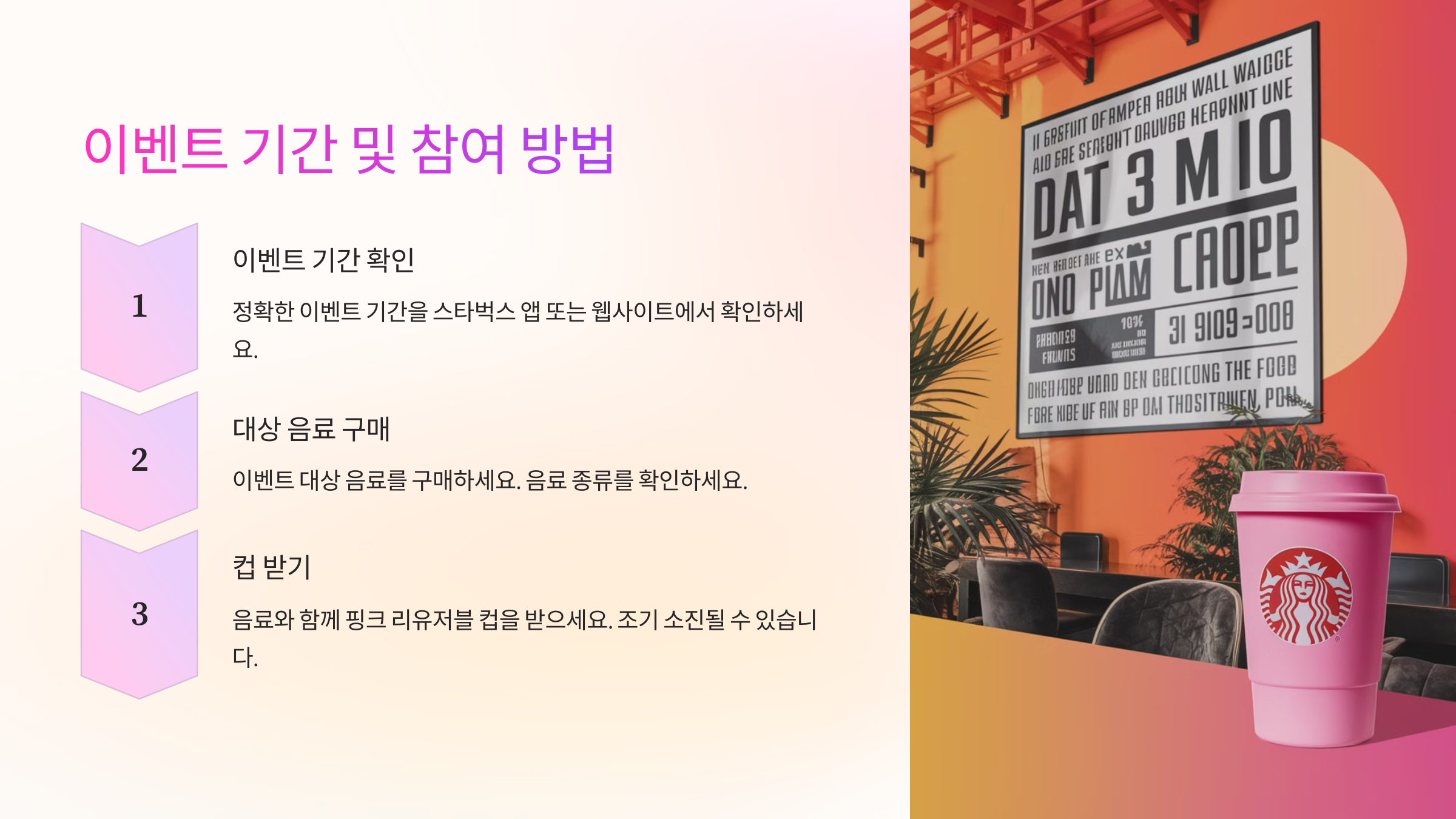 핑크 리유저블 컵은 환경을 생각하는 다회용 컵으로, 감각적인 디자인까지 갖춘 한정판 제품이에요. 1인당 최대 4잔까지 구매 가능하며, 하루 제공 수량이 한정되어 있으니 서둘러 방문하는 게 좋아요. 이제 이벤트의 자세한 내용을 알아볼까요? 😊