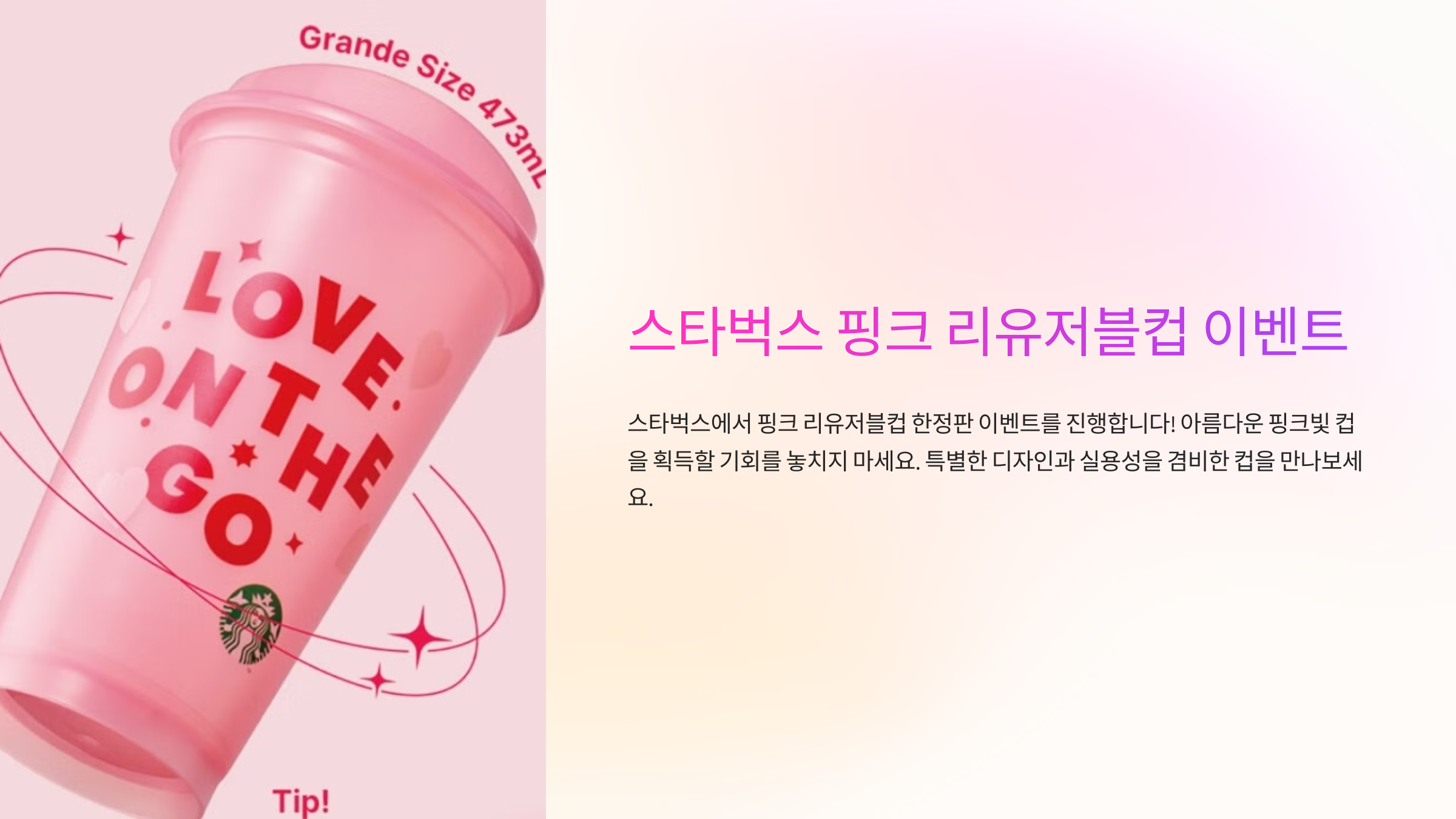 스타벅스의 핑크 리유저블 컵 이벤트는 한정된 기간 동안만 진행되는 특별한 행사예요! 감성적인 디자인과 실용성을 갖춘 한정판 컵을 받을 수 있는 기회, 놓치지 마세요! 😊