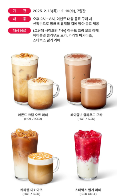 스타벅스에서 한정판 ‘핑크 리유저블 컵’ 이벤트를 진행해요! 2025년 2월 13일(목)부터 2월 19일(수)까지 단 7일간 오후 2시부터 8시까지 특정 음료를 구매하면 특별한 핑크 리유저블 컵에 담아 제공된답니다. 이 이벤트는 매장에서 직접 주문해야 하며, 사이렌 오더, 드라이브스루(DT), 딜리버리 주문은 제외돼요.