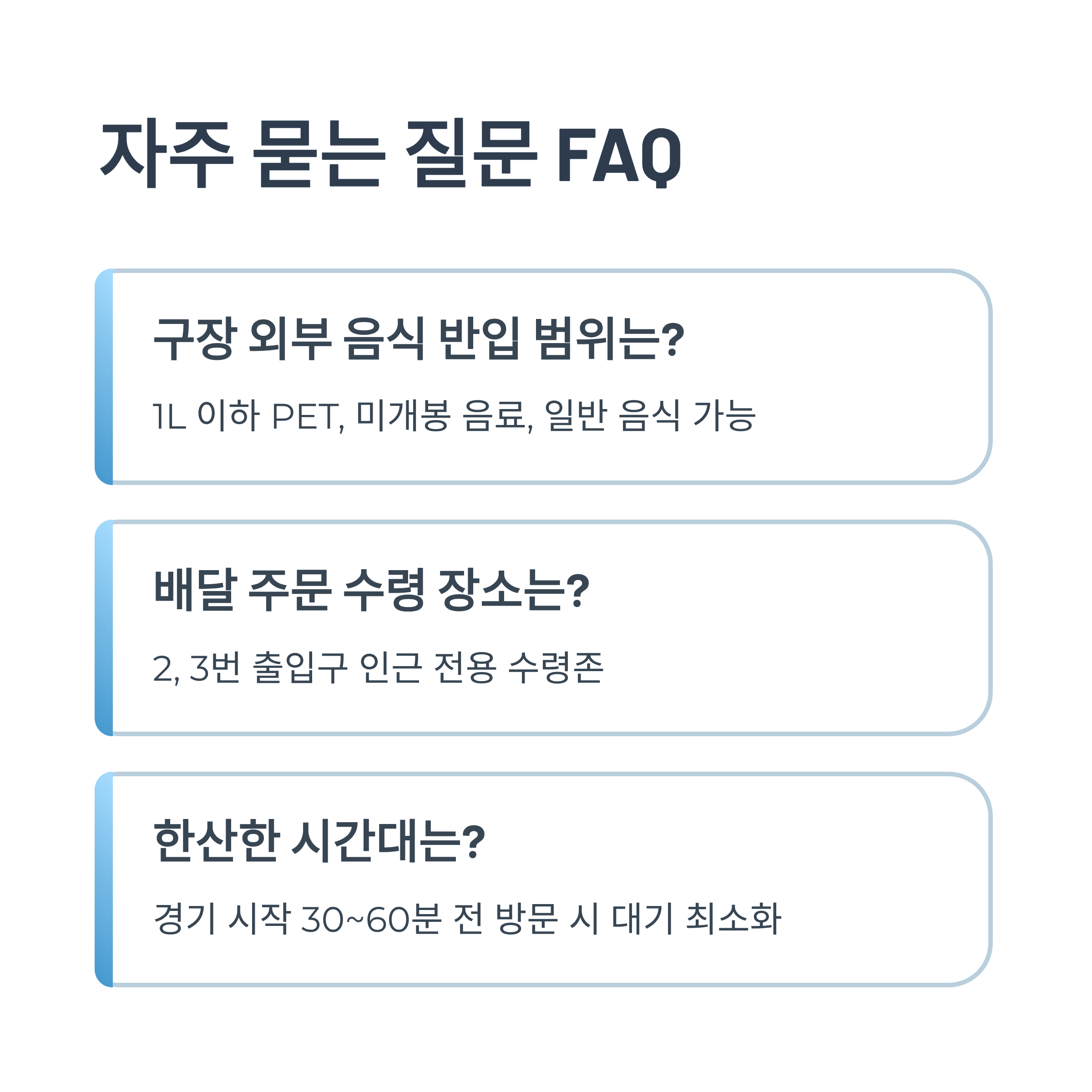 A4. 구장 내 지정 판매처에서만 구입할 수 있고, 외부 반입은 금지돼요.