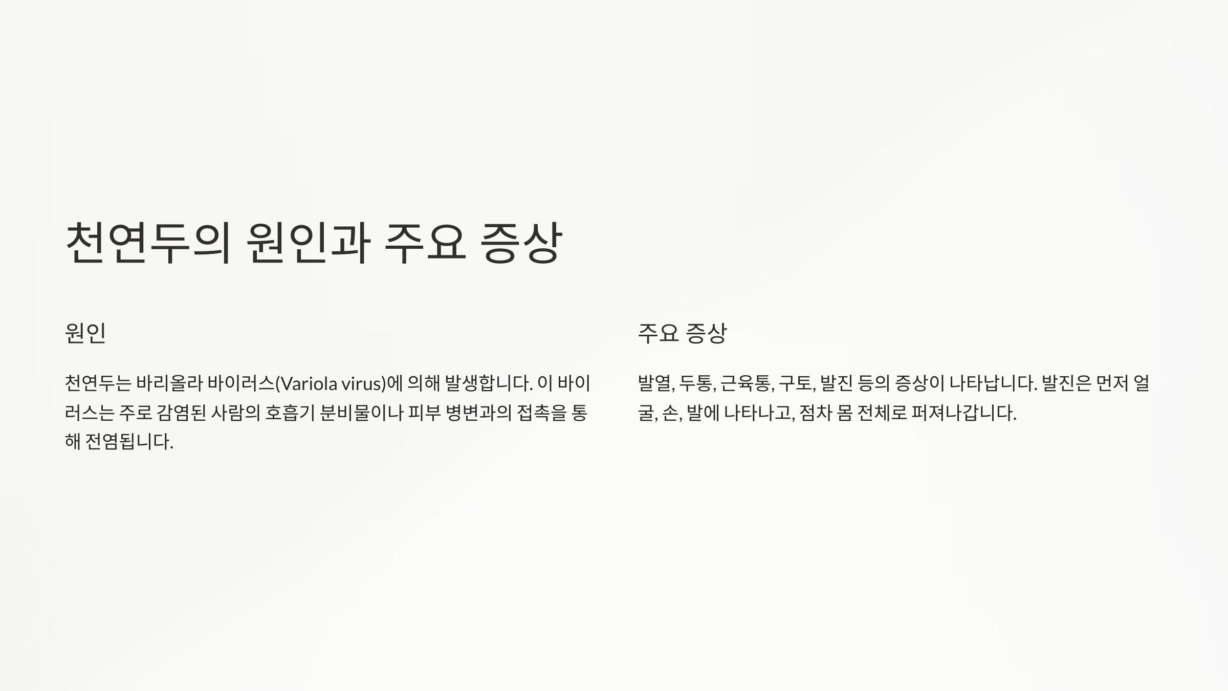 📌 천연두는 단순한 열병이 아니라, 피부에 남는 깊은 흉터까지 남기므로 조기 예방과 대응이 필수적이에요!