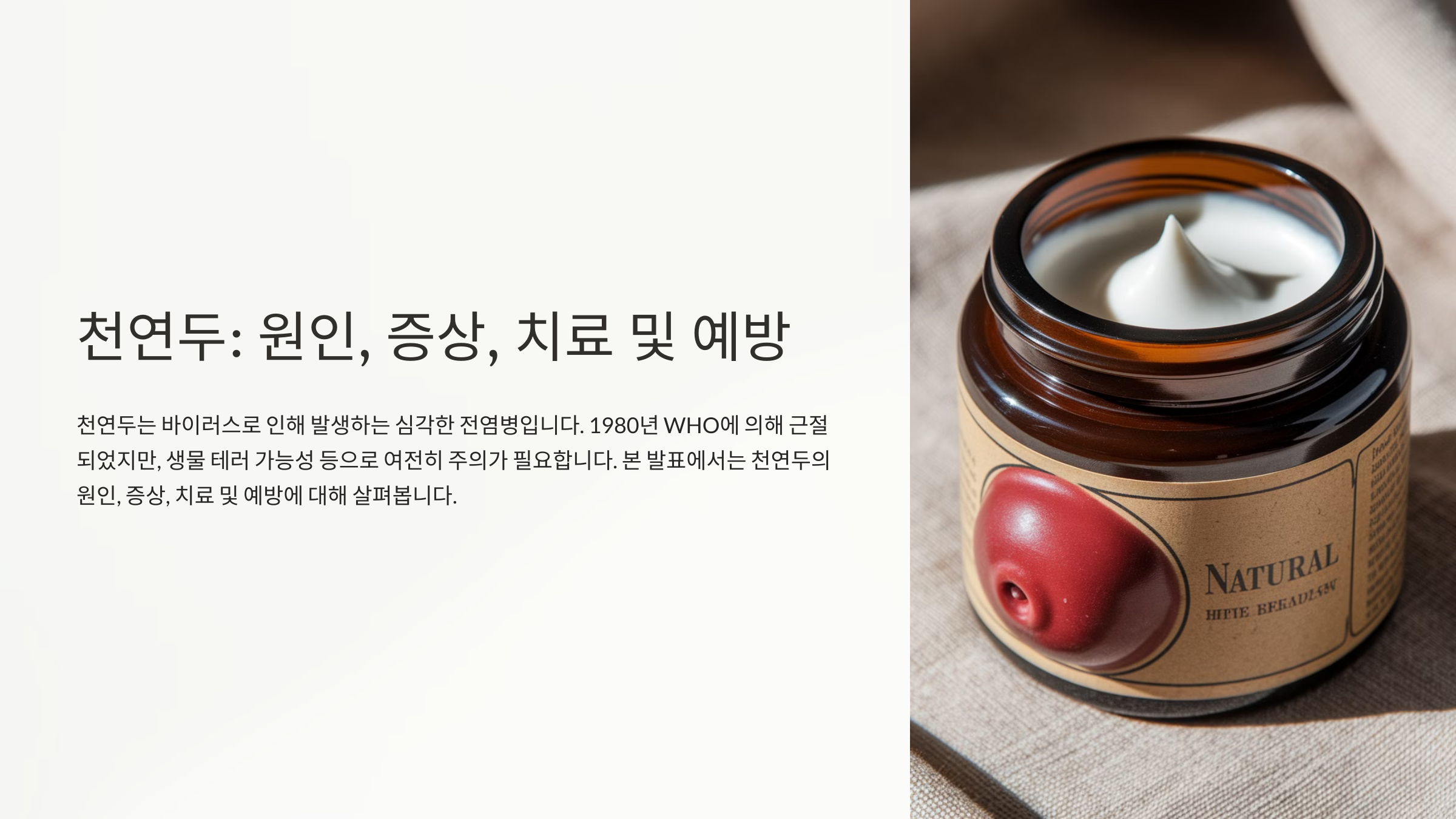 현재 자연 발생 사례는 없지만, 연구실에서 보관 중인 바이러스 표본과 생물학적 테러 위험성 때문에 천연두에 대한 연구와 백신 개발이 지속되고 있어요. 또한, 유사한 바이러스성 질환들이 존재하기 때문에 천연두와의 감별 및 대비가 여전히 중요한 상황이죠.
