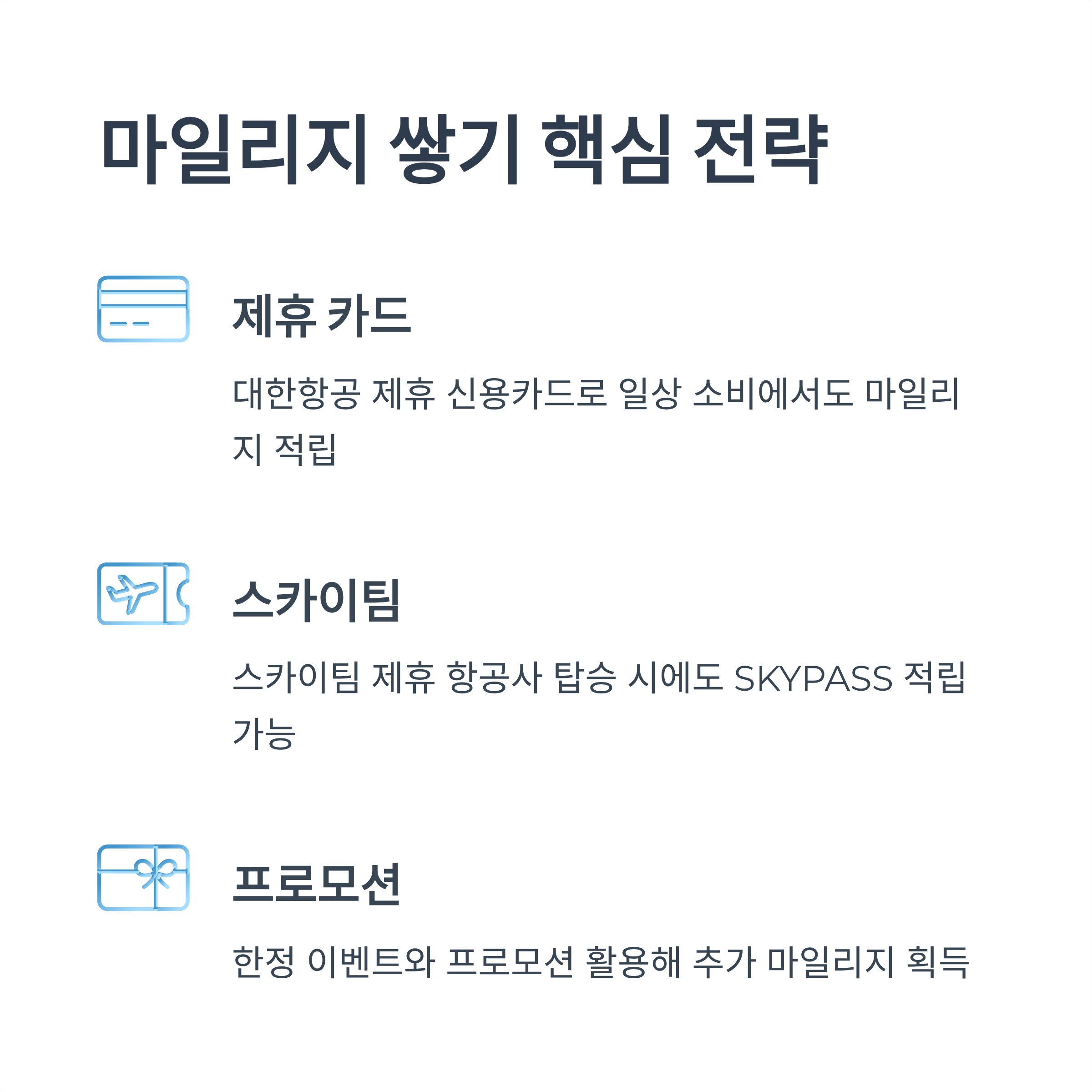 둘째, 마일리지 제휴카드를 적극 활용하는 거예요. 1,000원당 1~2마일을 적립해 주고, 특정 업종(예: 항공, 여행, 해외 결제)에서는 추가 적립 혜택도 받을 수 있어요. 카드사마다 연회비와 혜택이 다르니 비교 후 선택하는 게 좋아요.