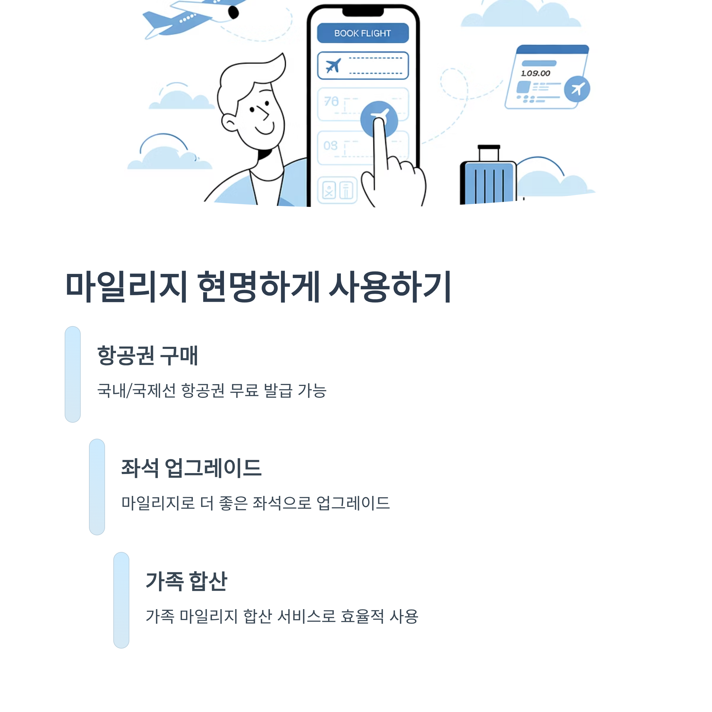 이렇게 적립 전략을 알면 마일을 빠르게 모을 수 있고, 원하는 시점에 큰 혜택을 볼 수 있어요. 다음은 이 마일을 실제로 어떻게 쓰면 좋은지, 사용 방법을 알려 드릴게요.
