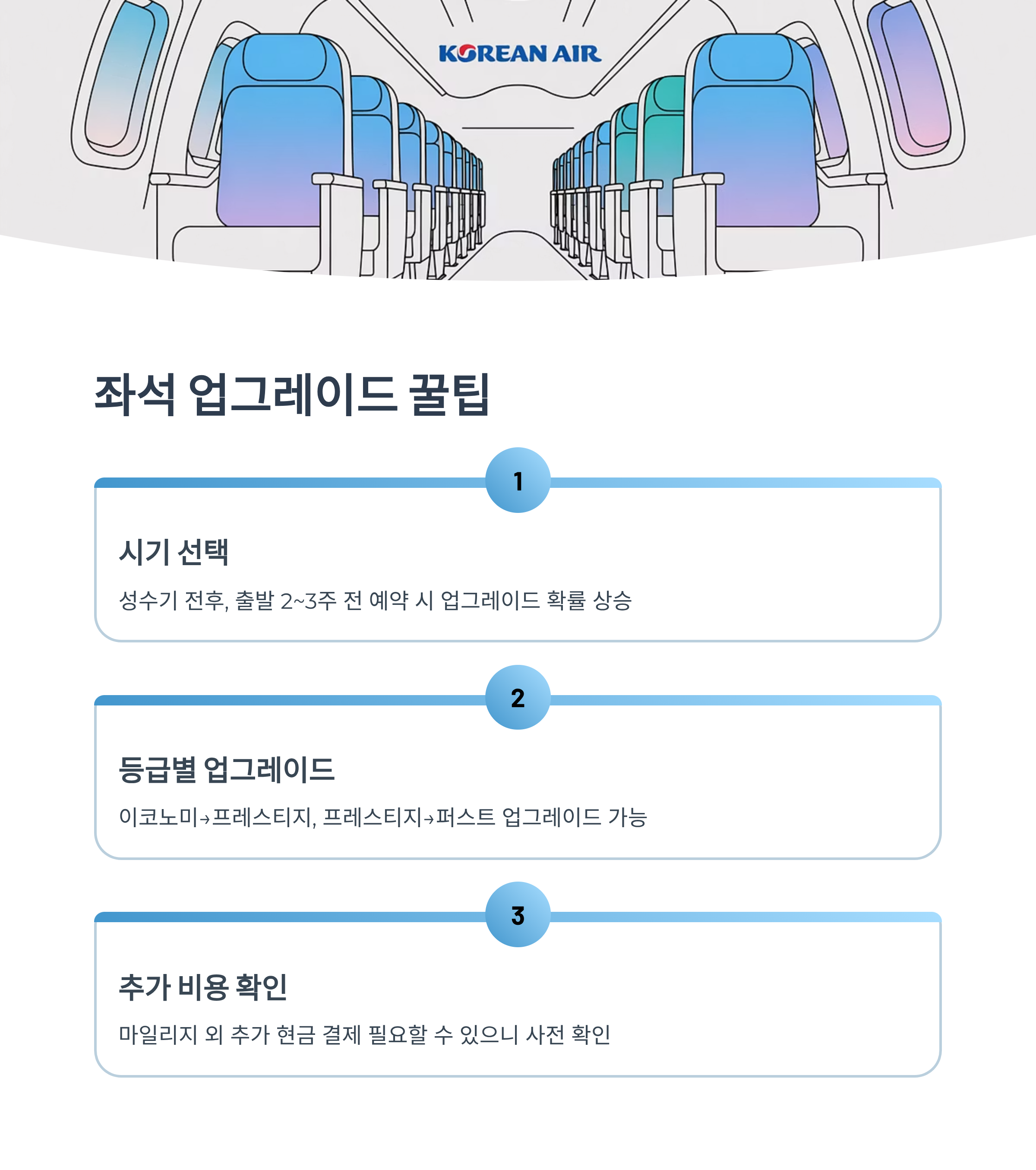 다만 업그레이드 시 적립 마일은 원래 구매한 좌석 등급 기준으로 계산돼요. 즉, 일반석에서 비즈니스로 승급해도 적립률은 일반석 기준이에요. 업그레이드를 선택할 땐 이 점을 꼭 고려해야 해요.
