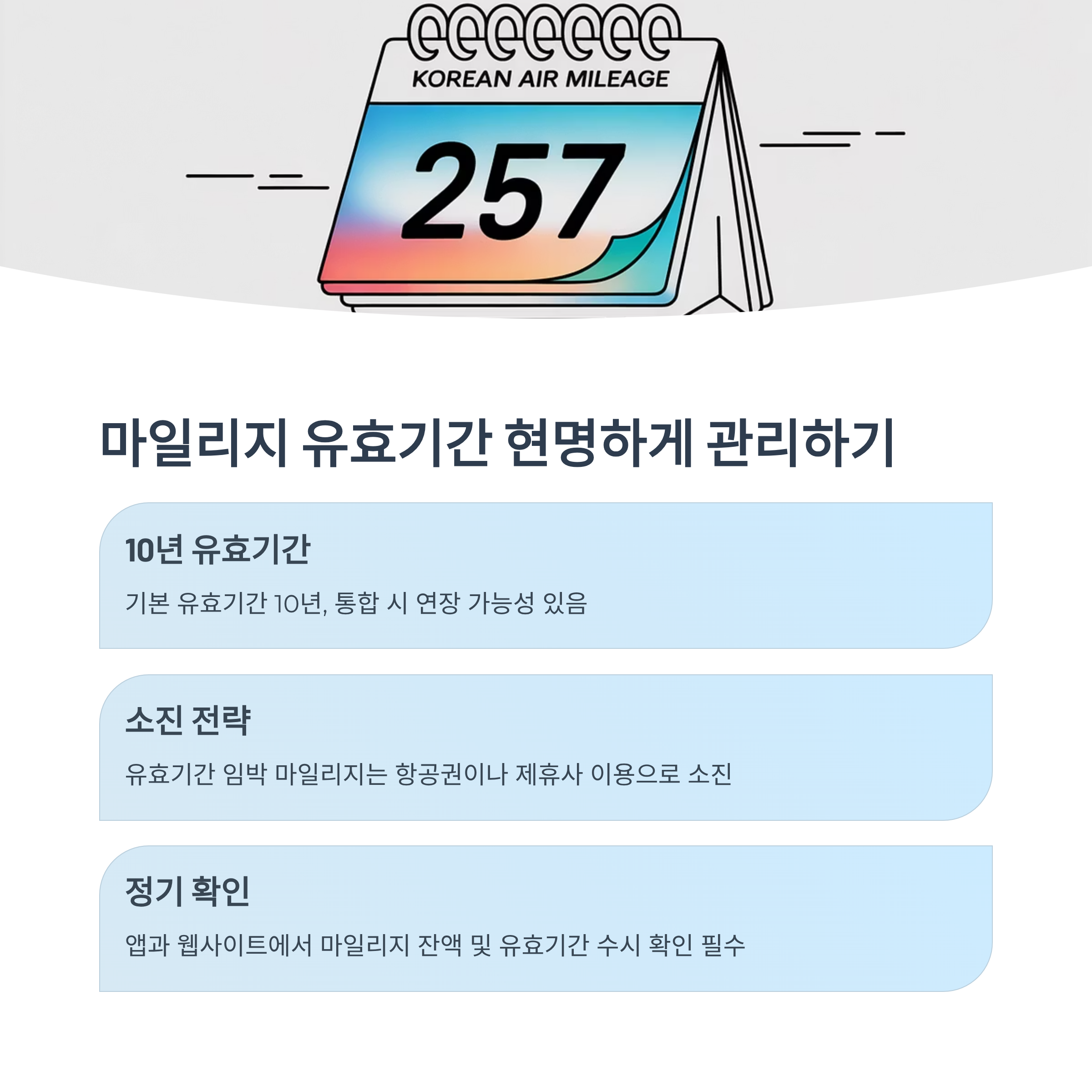 대한항공 마일리지는 2010년 7월 이후 적립분부터 10년 후에 소멸돼요. 예를 들어, 2015년 8월에 적립한 마일은 2025년 8월 말에 사라져요. 따라서 오래된 마일부터 먼저 사용하는 습관이 필요해요.