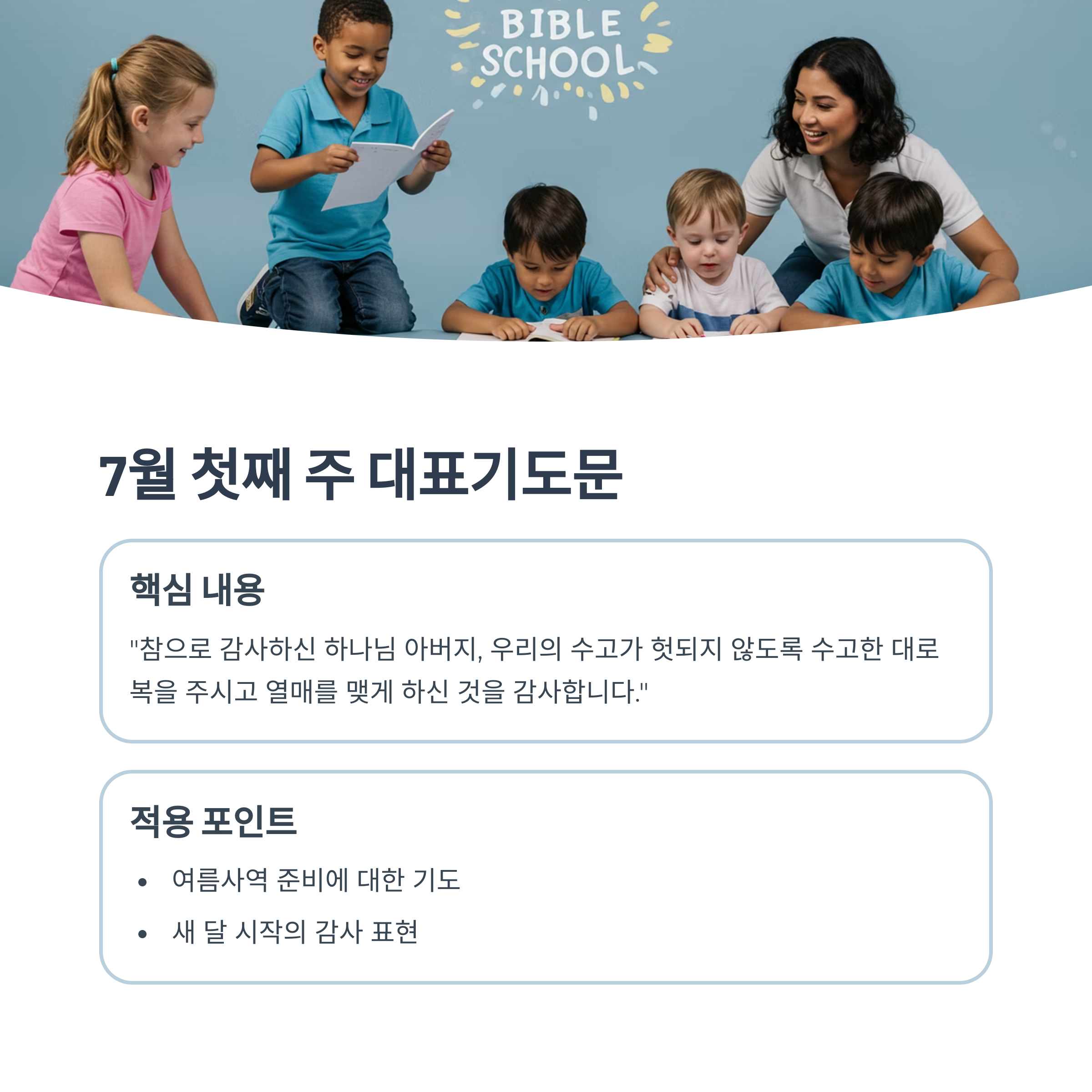 7월은 한 해의 중간을 넘어서며 하나님께 우리의 걸음을 다시금 올려드리는 계절이에요. 무더위 속에서도 주님의 사랑은 더욱 뜨겁고, 우리의 기도는 식지 않기를 소망하며 이 대표기도문들을 준비했답니다.
